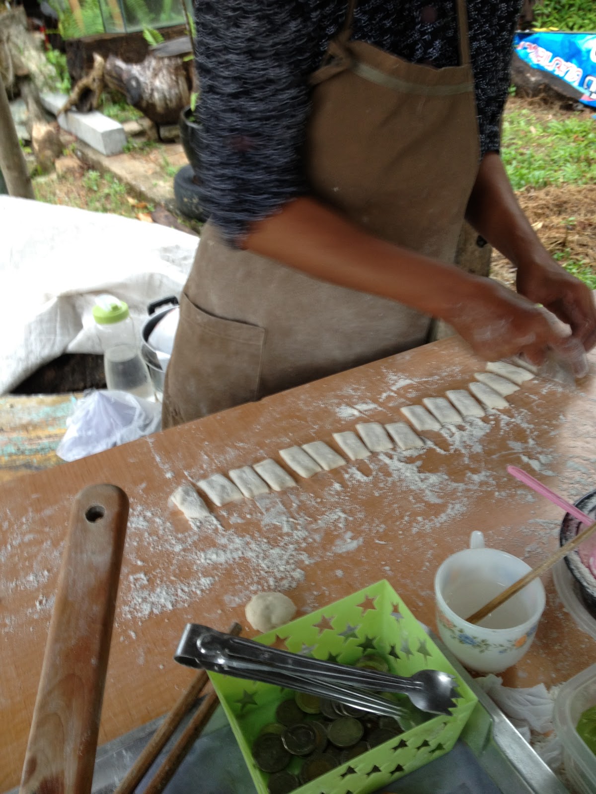 The dough is made early in the morning and then left to rise. Then some of the dough is taken and rolled into a long thin strip and cut into about one inch-long pieces.